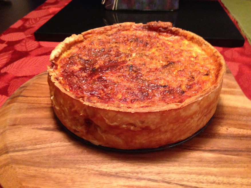 Smoked Salmon Quiche with leeks, aged sharp cheddar, pate brisee crust.